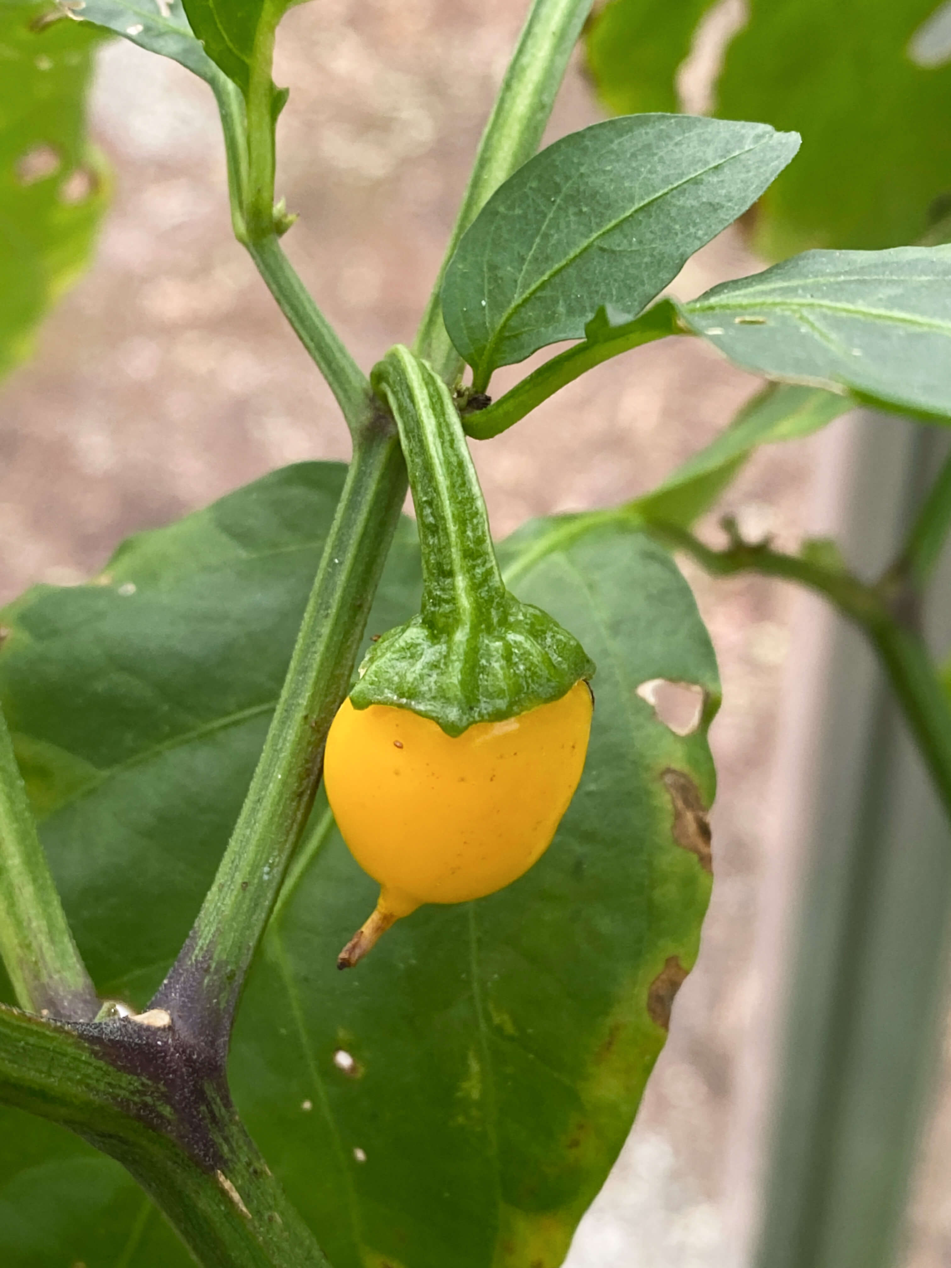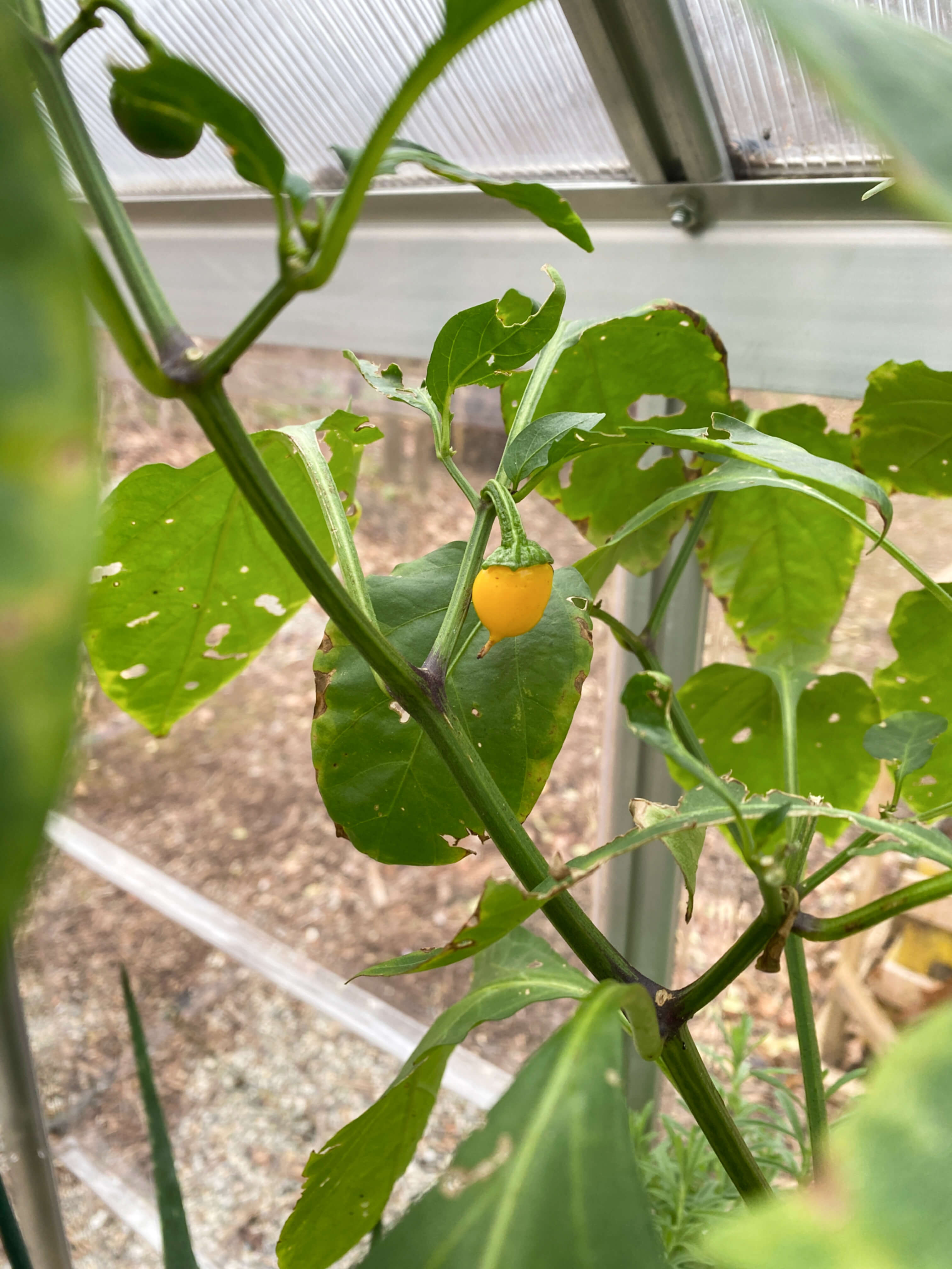 This summer, we had a big struggle with slugs in the garden beds so you can see the leaves are quite chewed through, but the plants continued to flower and persevere regardless. In the greenhouse, they look a little raggedy, but they are still growing so we are encouraged. Unintentionally, we may have stunted them a bit when we moved them to the greenhouse during their early post-flower days as they are now producing smaller fruit. But nevertheless, one pepper so far has turned yellow, which means in theory, it is ready for picking even though it’s just a little pip of a pepper. I’m going to leave it on the plant for a few more days to see if it grows any bigger – otherwise, we’ll pull it and see how it tastes.