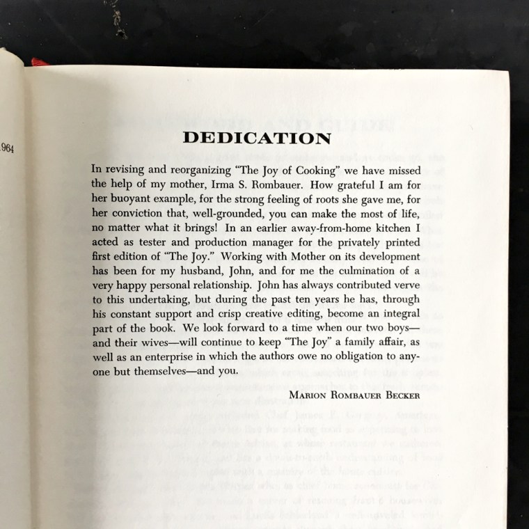 The 1964 edition of the Joy of Cooking came out two years after Irma died, the first edition to be edited, revised and enhanced by Irma’s daughter, Marion and Marion’s husband, John. Not without its own dramas, this edition needed all the cockaigne it could get. The first printing of the 1964 edition was published without Marion’s final approval, which meant that various inconsistencies and typos were present. This drove Marion crazy, as she wanted to really honor her mother’s work and keep up with the trusted reputation that the Joy brand had accumulated over 30 years since its debut in 1931. So the 1964 edition went through several reprints in order to right all the wrongs that Marion doggedly corrected herself. You get a sense of the enormous responsibility and weight of the legacy that Marion felt surrounding the whole Joy endeavor from her dedication at the beginning of the book…