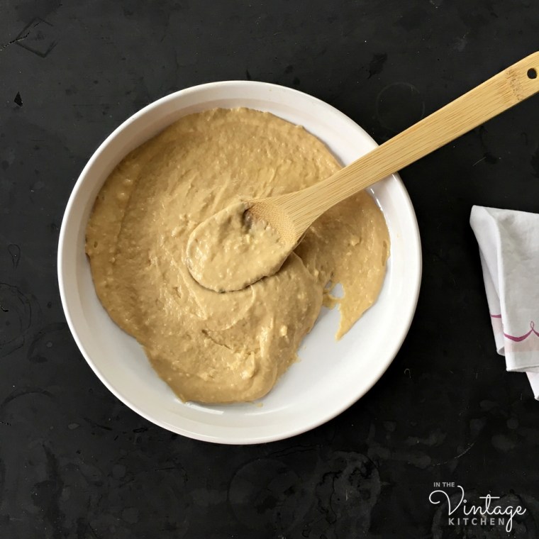 Add the egg mixture to the flour mixture and stir until a stiff dough forms. Spread the dough mixture evenly on the bottom of your pan or baking dish and then set aside. (Note: Irma recommended a 9×9 x 2 1/2 inch pan but I used a round 10″ inch x 2″ inch baking dish and that worked great as well).