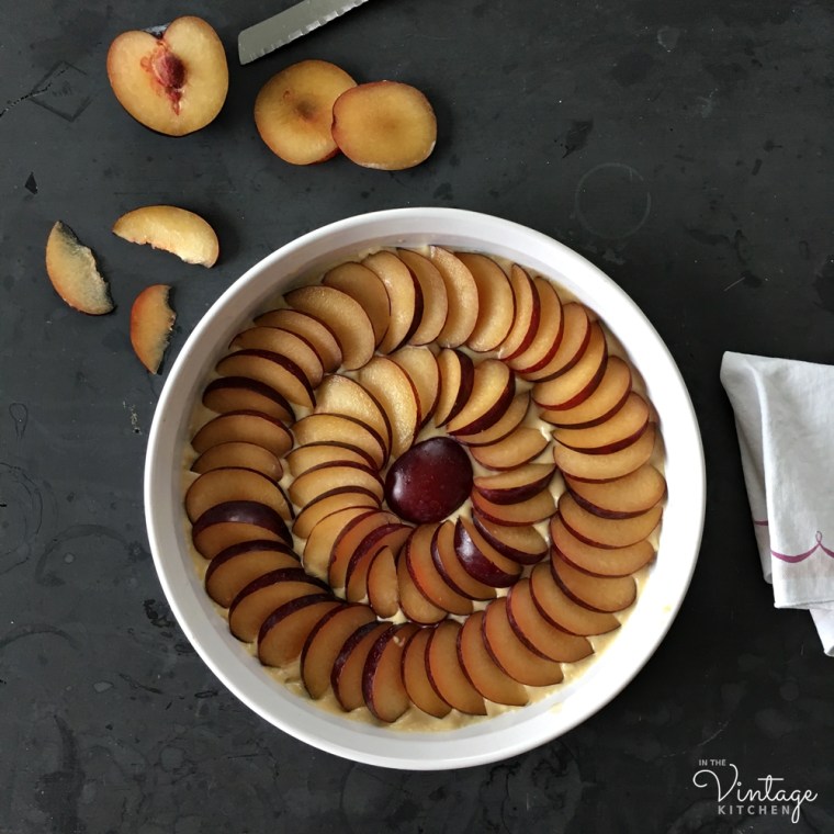 Next, thinly slice your plums so that you will have enough to overlap each one in your pan – tart style and then arrange them on top of the dough. This is the fun, creative part! You can make many different types of designs with your plums if you like.