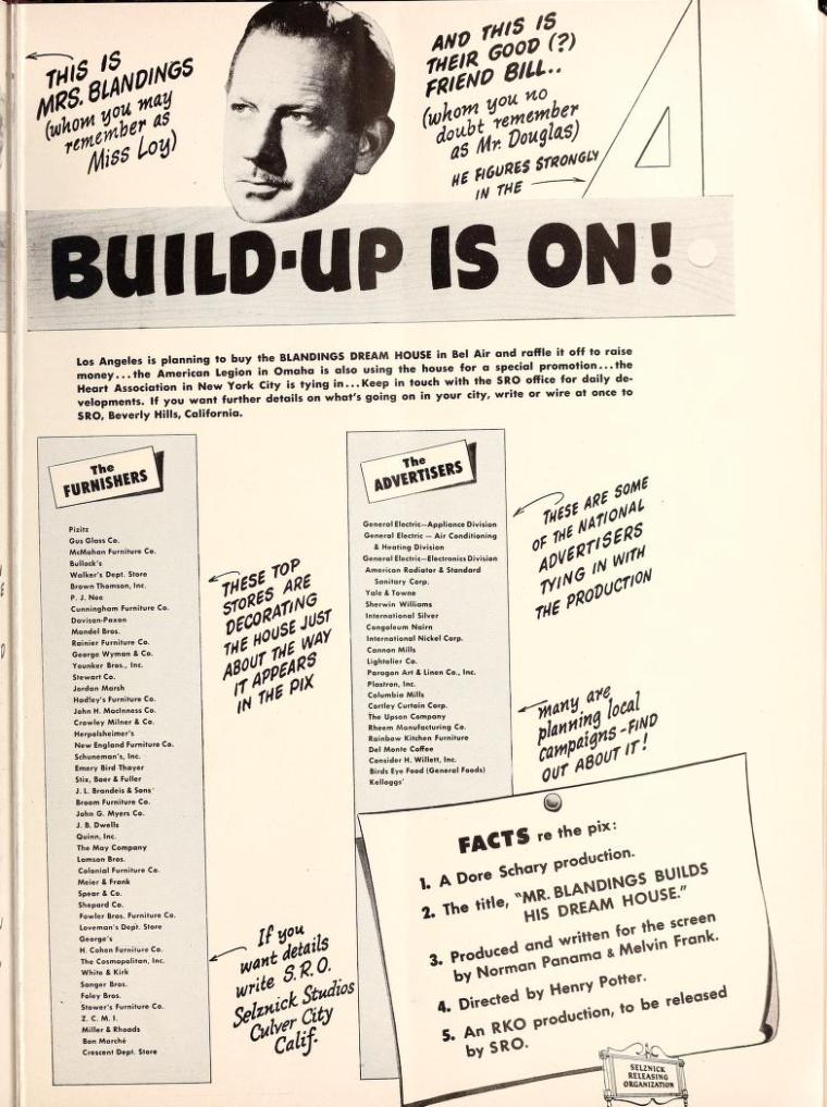 When the movie first premiered in New York in March of 1948, ad campaigns began rolling out across the country announcing the Dream House Build-Up, so that by June when the Blandings were in theaters nationwide, the excitement and anticipation was at a fever pitch.