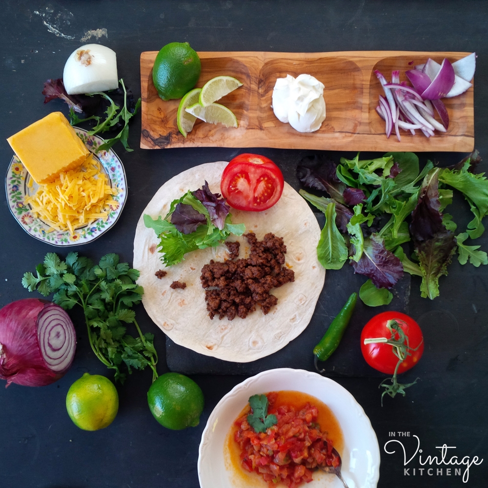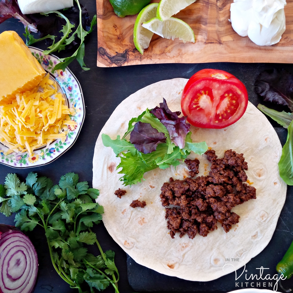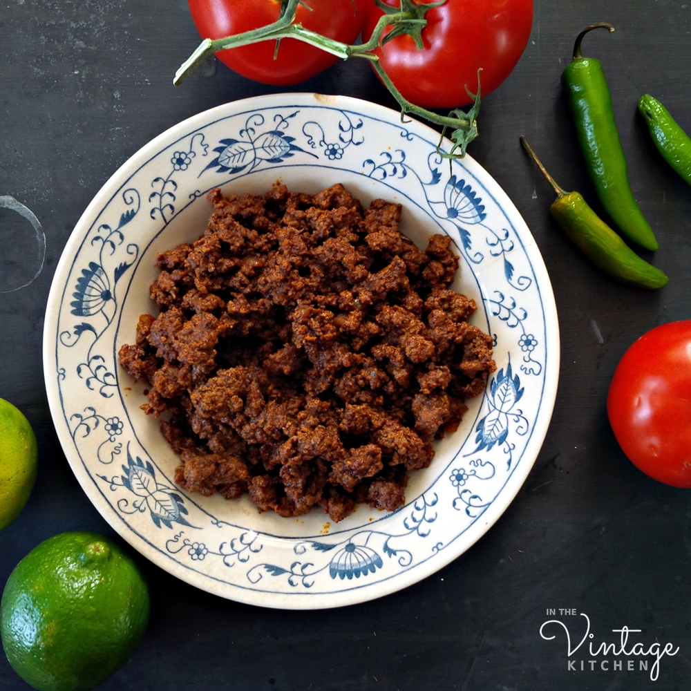 What’s especially great about the Carne Mexicano recipe is that it includes vinegar which gives it a little bit of tang and de-greases the pan all at once so you don’t need a thickening agent like cornstarch or flour which is included in most commercial taco seasoning packets. As with many vintage recipes, we cut down the salt by 2/3rds, so we recommend starting with our measurement first and adding more to taste if you feel it needs it.