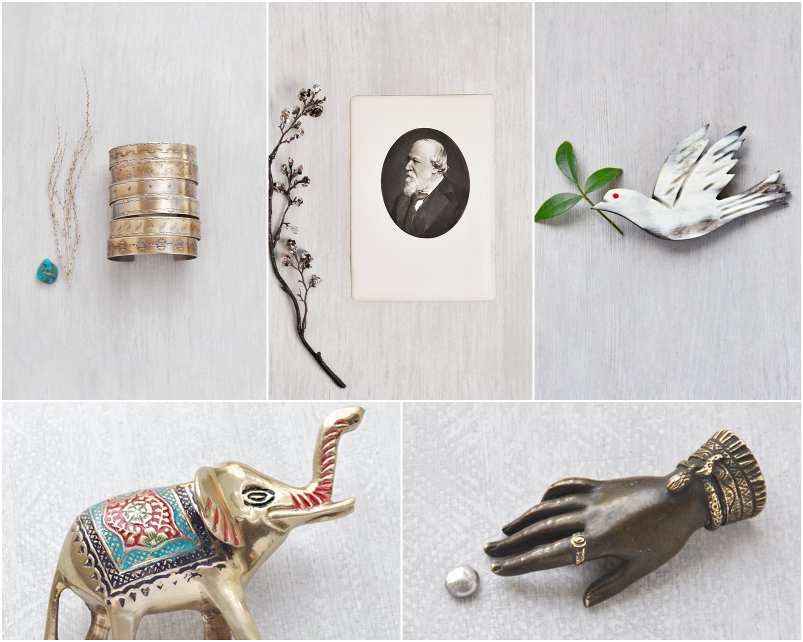 A fun sampling of items that you’ll find in the Curiosity Cabinet… from top left: Vintage Southwestern Brass Cuff, Portrait of Robert Browning, Vintage Carved Horn Bird Brooch, Antique Brass Hand Paperweight, Vintage Brass Elephant Figurine.