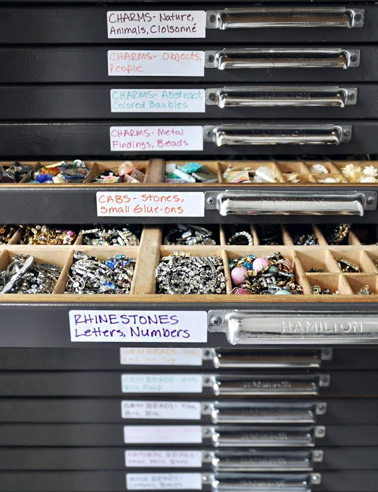 It’s easy for me to pull sets together because I keep my huge collection of jewelry bits very organized. I have a large vintage letterpress cabinet, several craft drawers, boxes and glass jars full of stuff. Everything is sorted by type; hearts, flowers, animals, celestial, bead clusters, rhinestones… that way I can find what I need quickly!