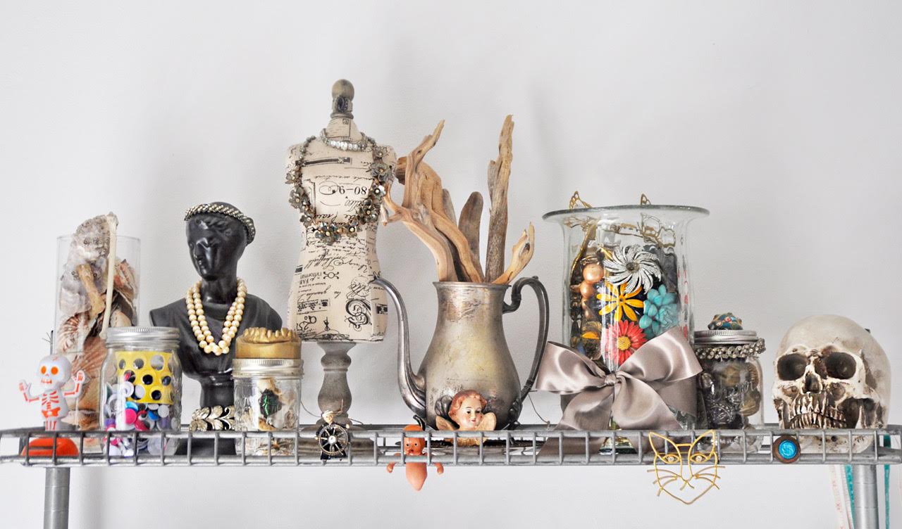 As one of the original pioneering artists of Etsy, Heather has been around the handmade marketplace since 2005 but her designs and ultimate inspiration go way back to her grandmother Jane Dean, whose name Heather not only borrowed for her shop but whose collector’s spirit Heather tries to instill in all her pieces. What I love about Heather’s work is that she is a storyteller in sparkles and shimmer, offering a new way of looking at familiar objects from a finder’s point of view. A brooch becomes a magnet, a bauble becomes a bracelet, an arrow becomes a compass in the same way that your commonplace, everyday, utilitarian refrigerator suddenly becomes the canvas for a glamorous work of art.