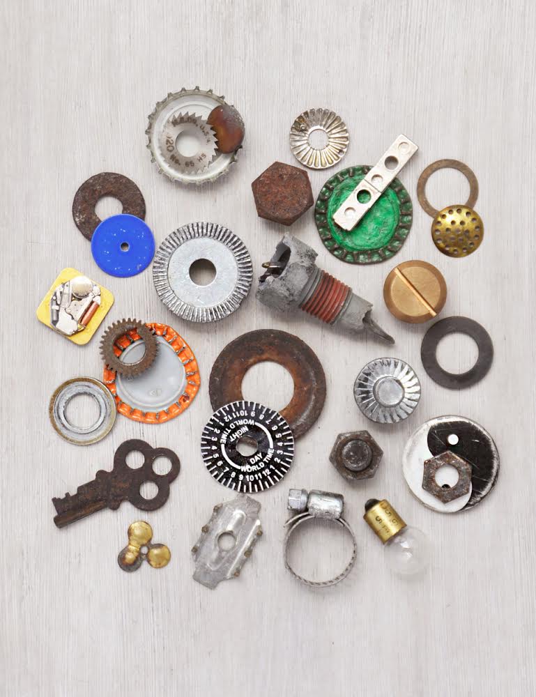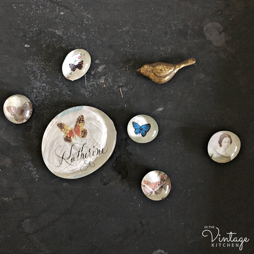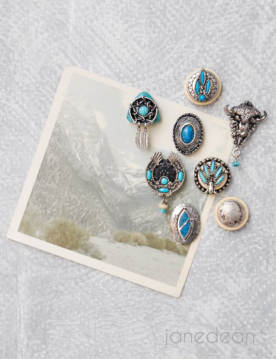 I had been buying box lots of old jewelry so I could use the components in my own designs. I was mostly looking for pieces that could be used in necklaces and charm bracelets, but I ended up with a surplus of broken bits and bobs, orphan earrings, etc. that didn’t really work for my jewelry making. One day, I decided to glue magnets on the back of a few old pieces and they turned out really cool! They sold well and soon became my favorite things to make. My first magnet sets were fairly simple but over the years they have become much more complex, with several pieces stacked on top of each other and often embellished with paint, rhinestones and charms. I also love using rustic found objects like old bottle caps, rusty washers and miscellaneous thingamabobs. I’m always finding things on the ground and putting them in my pocket to be used later in a creative project. When I do my laundry I usually find some kind of nut, bolt or pebble in the lint trap, because I always forget about the little treasures in my pockets!