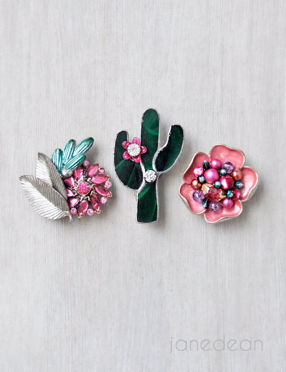 Ta-dah! It is a trio of floral fridge magnets handmade from vintage costume jewelry. These beauties are the work of Heather Dean, the Los Angeles based artist behind Jane Dean Gems, an online jewelry and home decor shop that specializes in pieces made from vintage items and found objects.