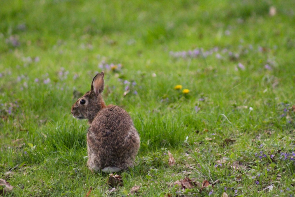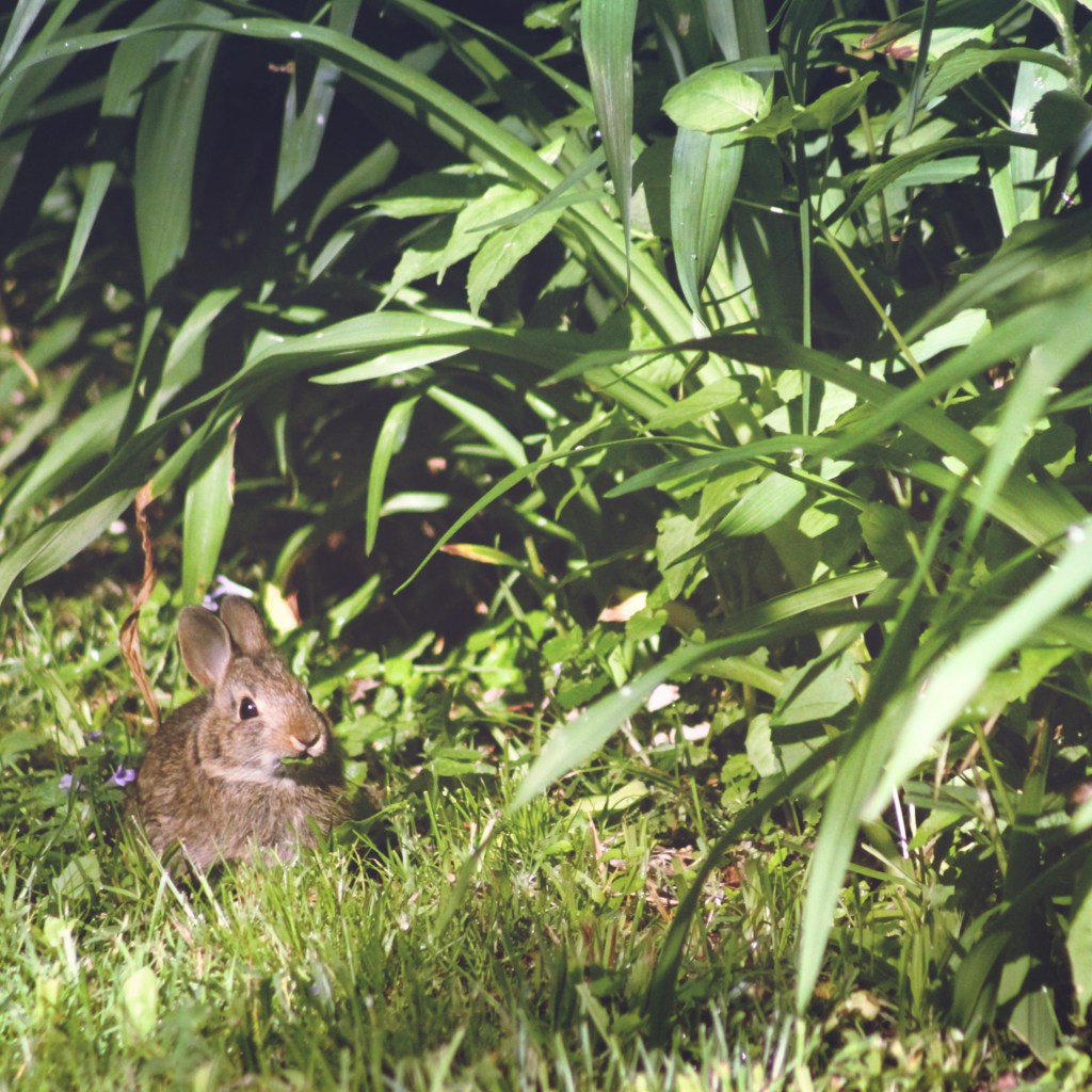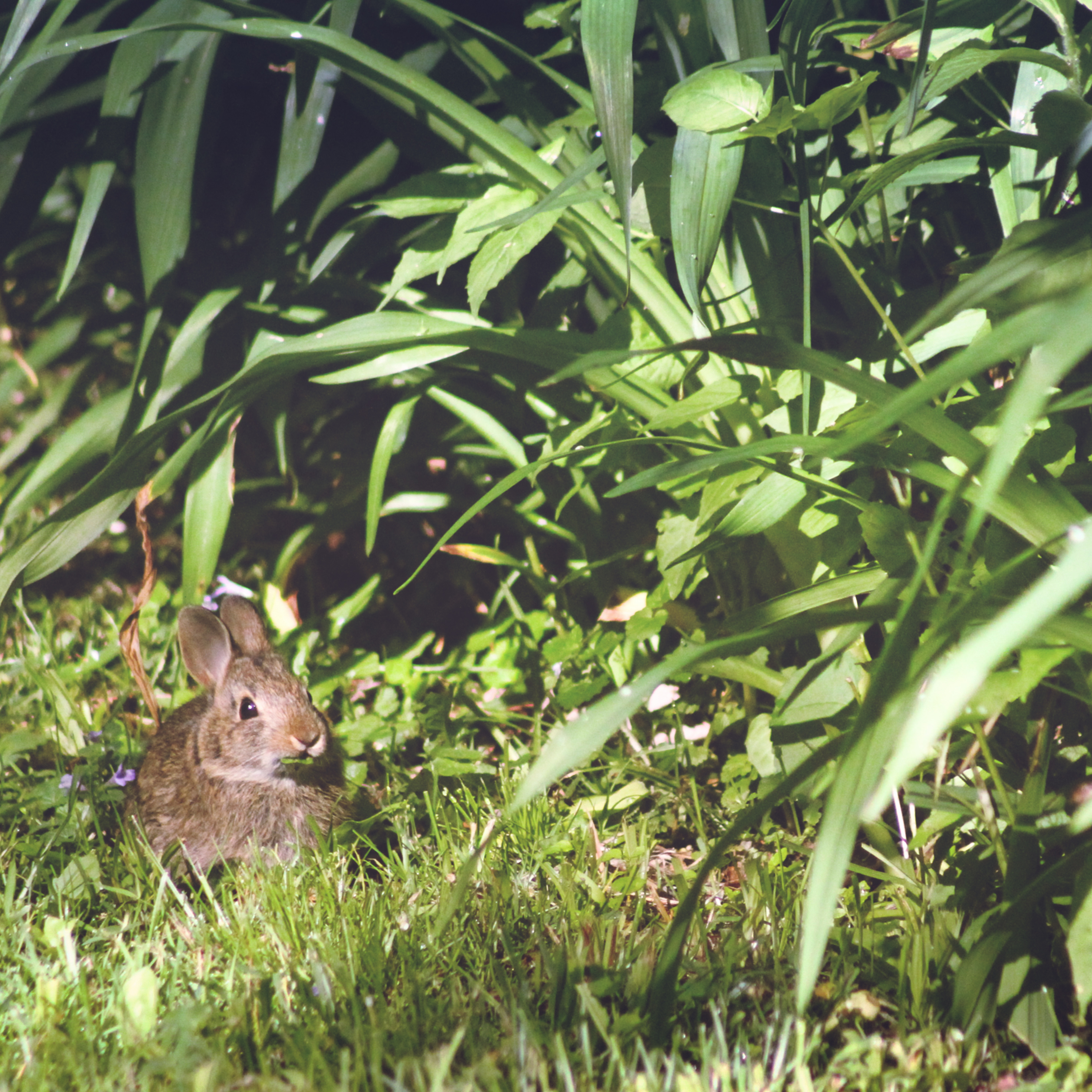 If I walk out of the back door very quietly on these early, almost-summer mornings, I can usually spot Lily eating grass at the edge of a way too overgrown decades-old daylily bed. Lily, as we came to call her due to her preference for this area of the yard, is a baby rabbit about the size of a teacup. She was born to Lefty, a wild cottontail that lives in our woods.