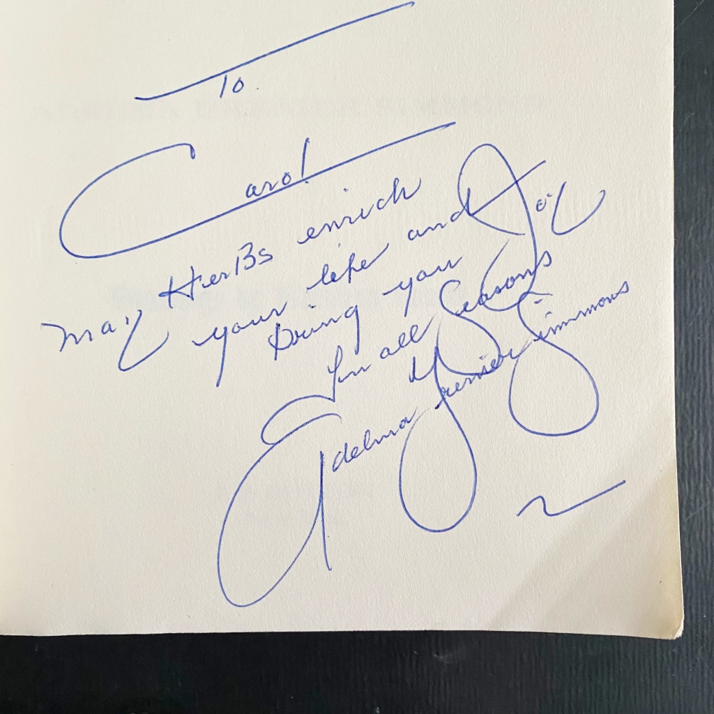 It wasn’t until after I was home that I noticed that Adelma had inscribed the book to a previous owner. To Carol, it reads… May herbs enrich your life and bring you joy for all seasons. Adelma Grenier Simmons.