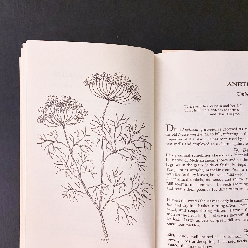Garden layouts, botanical drawings, black and white photographs, recipes, and poetry fill the pages of Herb Gardening in Five Seasons while also providing detailed information on seventy-seven different plants, an herbal dictionary, and a pronunciation guide. One of the things I love most about Adelma’s book are the lists in the back that organize groupings of herbs by name according to specific situations… Herbs for Bees, Herbs for Dry Soil, Herbs for a Meditation Garden, Herbs to Grow as Hedges, Herbs for Tall Accent, Herbs for Sun-Filtered Shade, etc. It’s that latter list that interests me most since the majority of the garden spaces at 1750 House are bathed in partial shade throughout most of the peak growing months.