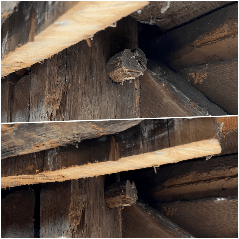 Before nails held houses together there were wooden pegs that did the job. In the kitchen, we uncovered several areas in the rafters where you can see these wooden pegs. They date to 1750, the year the house was built.