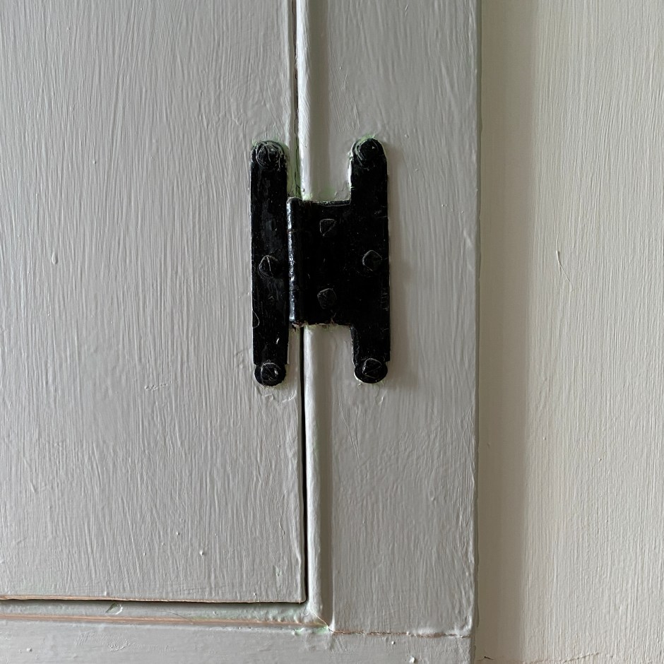 All over the house, including the kitchen, original wrought iron hardware is fastened to original doors and cupboards. The type of hardware that holds it all together is called an H-Hinge. An incredibly popular style of hinged bracket used during colonial times, there is a bit of superstition wrapped up in its form and function that suggests why it was a favored domestic carpentry detail. According to legend, the H stood for holy and acted as a symbol of protection. Against witchcraft.