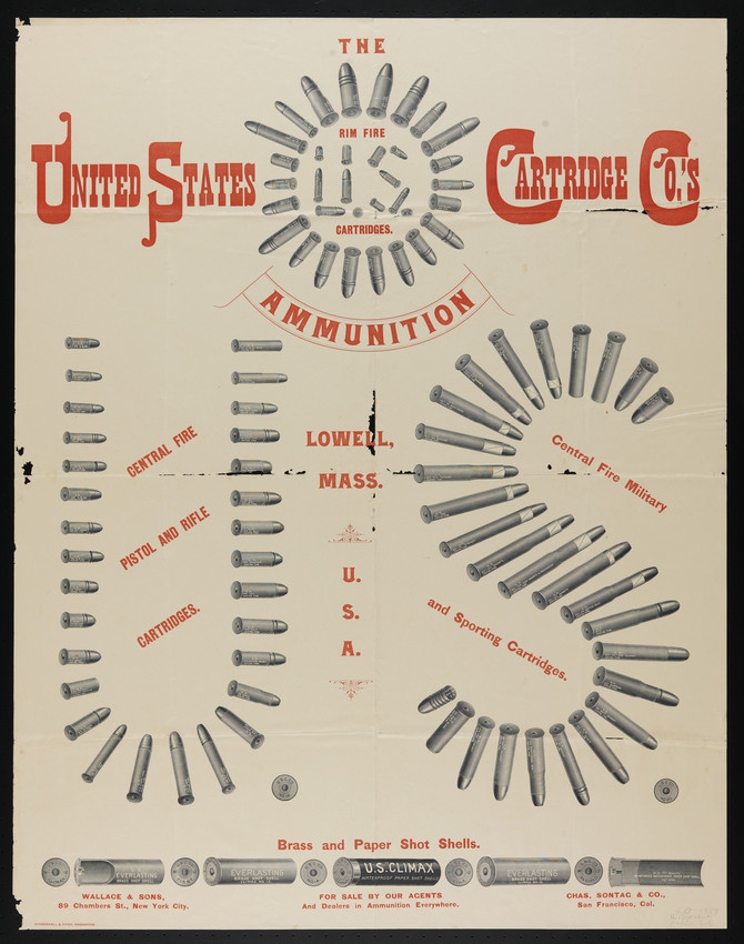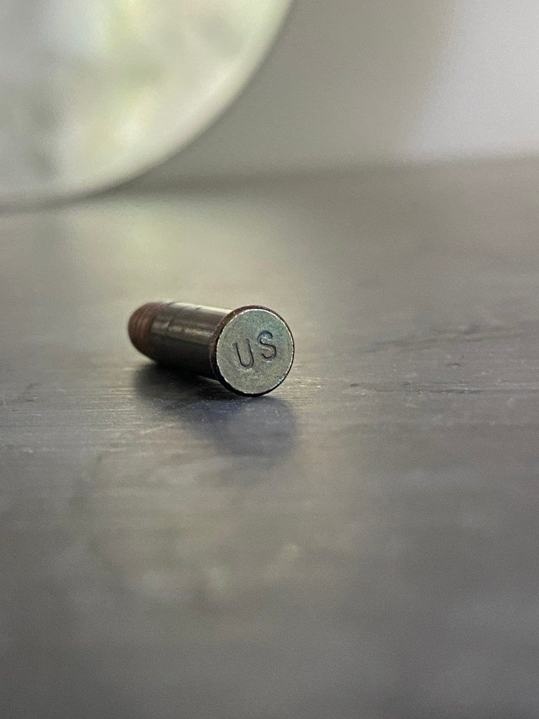 Never having researched guns or ammunition before, this was a real deep dive into the world of historic firearms. This bullet, officially referred to as an ammunition cartridge, was made by The United States Cartridge Company. Located in Lowell, MA from 1869-1927, USCC was one of the largest suppliers of ammunition during WWI, and produced ammunition for both the military and civilian use. This type of ammunition in particular is called a rimfire cartridge, with gunpowder located in the middle section and the bullet located at the tip. The design is known as a pineapple (vintage kitchen theme approved!) because it explodes in multiple directions once it hits its intended target.