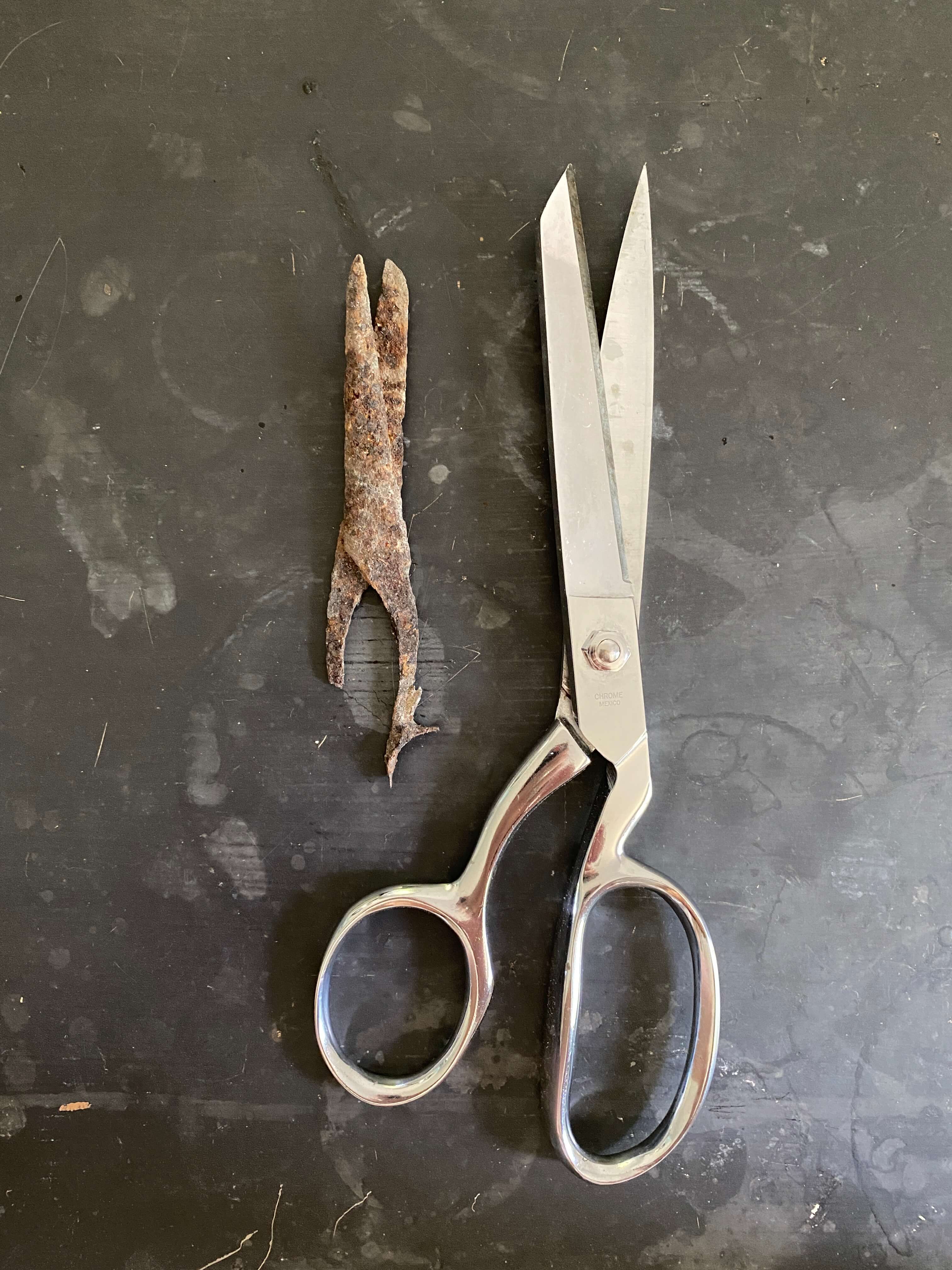 Although quite rusty, these primitive scissors look to be hand-forged and pretty old. Like the spoon, there are no marks or labels to help identify a maker or a year of manufacture but they are intact enough to see that they are short scissors, measuring just 4.5″ inches from the tip to the first turn of the handle. Here you can see them next to a pair of standard fabric sewing scissors to get an idea of size and shape.