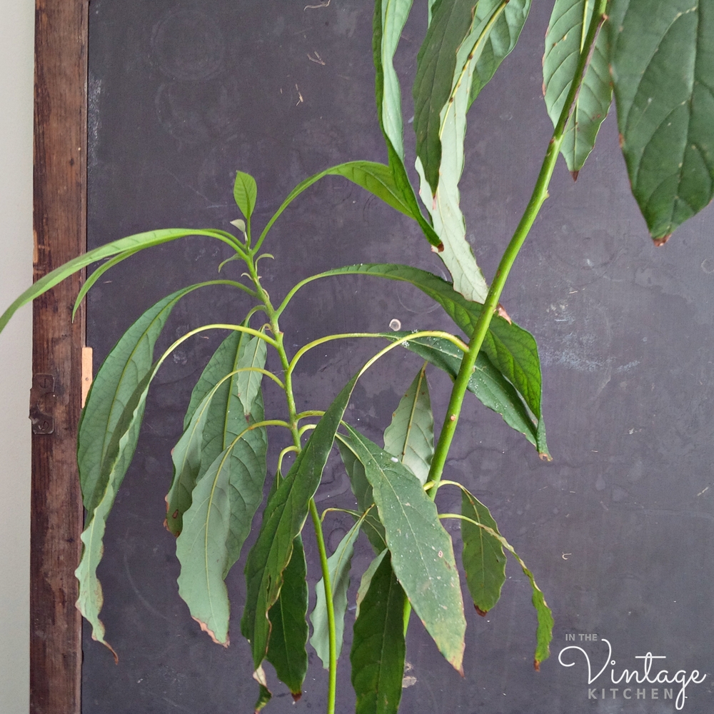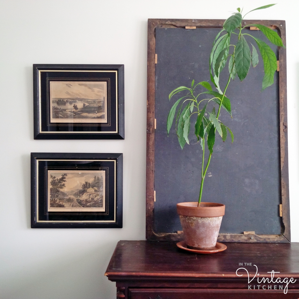 It’s National Avocado Day and I couldn’t think of a better way to celebrate than to write a post featuring the Vintage Kitchen’s favorite green guy – Avi the Avocado! When I last posted about Avi, it was February. The days were cold, somewhat scattered with snow flurries and spring was struggling to get its foot in the door. Avi was recovering from an almost fatal bout of too much tap water and too much sun. Here he was in February…