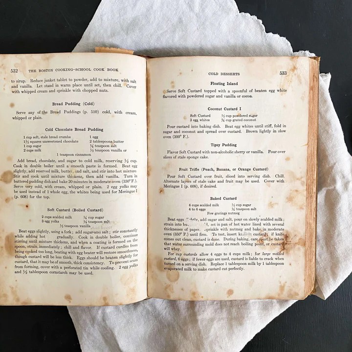 Cookbooks in the shop tell intimate stories not only of their authors but also their owners too. This 1931 edition of the Boston Cooking School Cook Book showcases the enduring legacy of Fannie Farmer (1857-1915), who not only raised generations of home cooks but shared recipes that still inform regional New England cuisine today. It also highlights, through a myriad of cooking splatters and stains, the adventures of a previous cook (or cooks) who cherished the recipes so much their culinary endeavors have turned into an artful aesthetic.