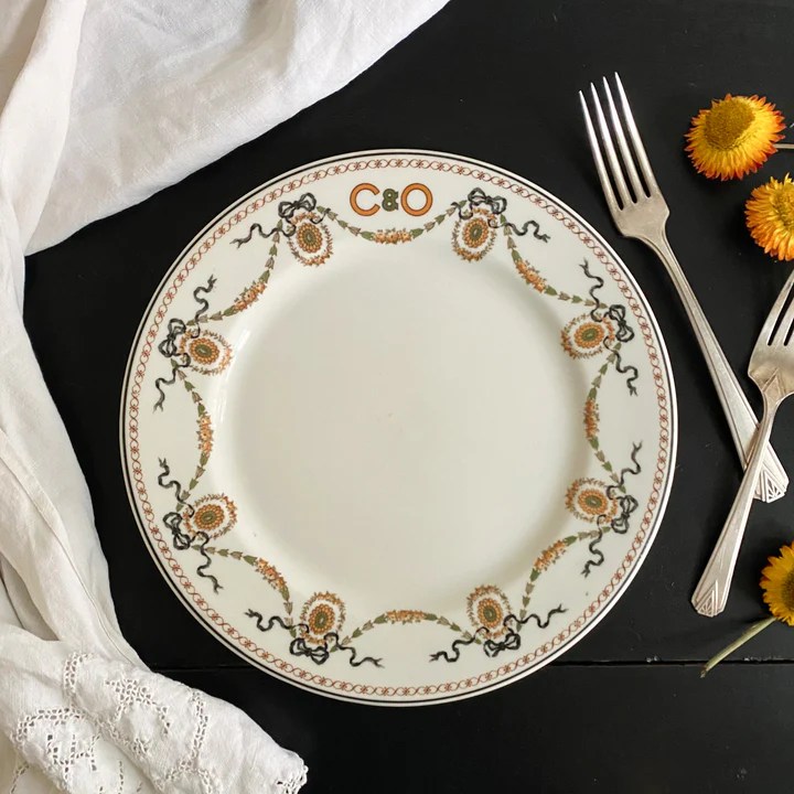 With its roots extending all the way back to canal transportation in the 1790s, the C&O Railroad has a long and winding history through the American landscape. Throughout most of its life, C&O trains hauled coal, agriculture, retail products, and travelers between Virginia, the Midwest, the Northeast, and parts of Canada up until the 1980s. In the 1920s, the decade in which this luncheon plate was made, the C & O trains looked like this…
