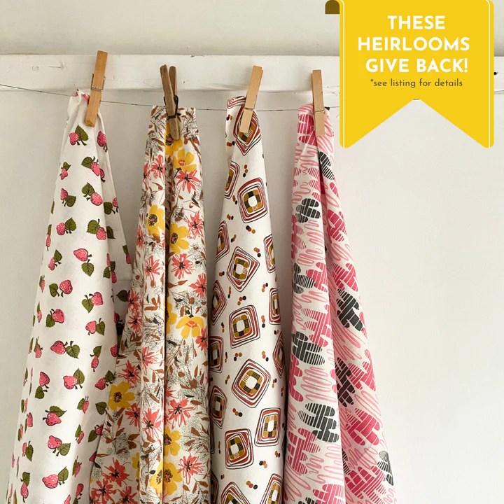 You can’t really get any closer to touching real-life history than these floral feed and flour sacks. Stitched into traditional sack shape, similar to a pillowcase, these bound together fabrics were once the commercial packaging that held a variety of pantry staples, including flour, sugar and grain. Made by the manufacturing industry in response to the financial burdens placed upon American families during the Great Depression, this cotton sack packaging was made solely for the purpose of recycling.