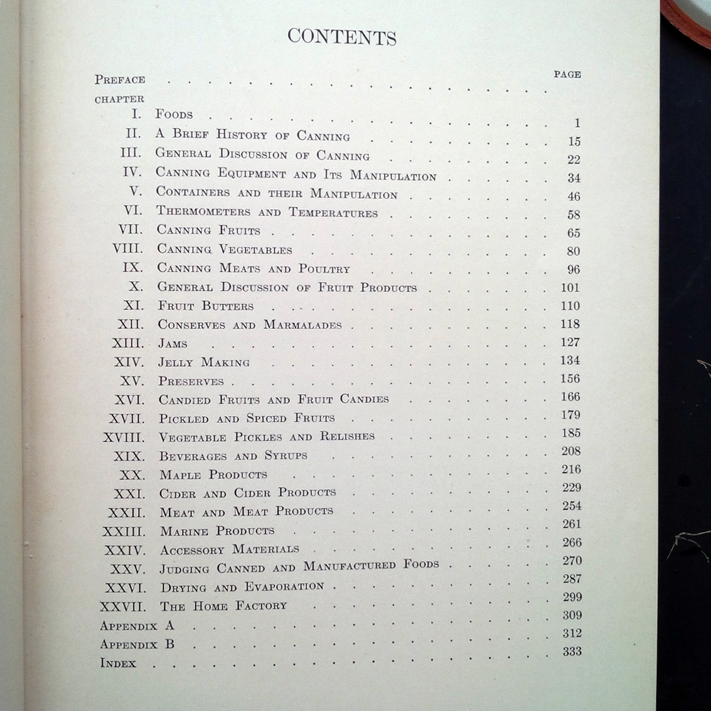 and how that led to the eventual creation of foods kept in sealed shelf-stable jars. In between the anatomy of vegetables, lists of equipment, instructions on canning methods, and advice on troubleshooting, shelving considerations, and cleanliness factors, Walter included a host of recipes explaining how to preserve summer’s bounty for next winter’s nourishment. He explained how to build canning stations, storage rooms and simple farm factories to accommodate production. Everything from cider to syrup, carrots to kerosine, fruits to fermentation were tackled. At the time of publication, Food Preservation was the most concise book ever written on the topic of canning and was so thorough it became the go-to teaching tool in food science classrooms for decades.