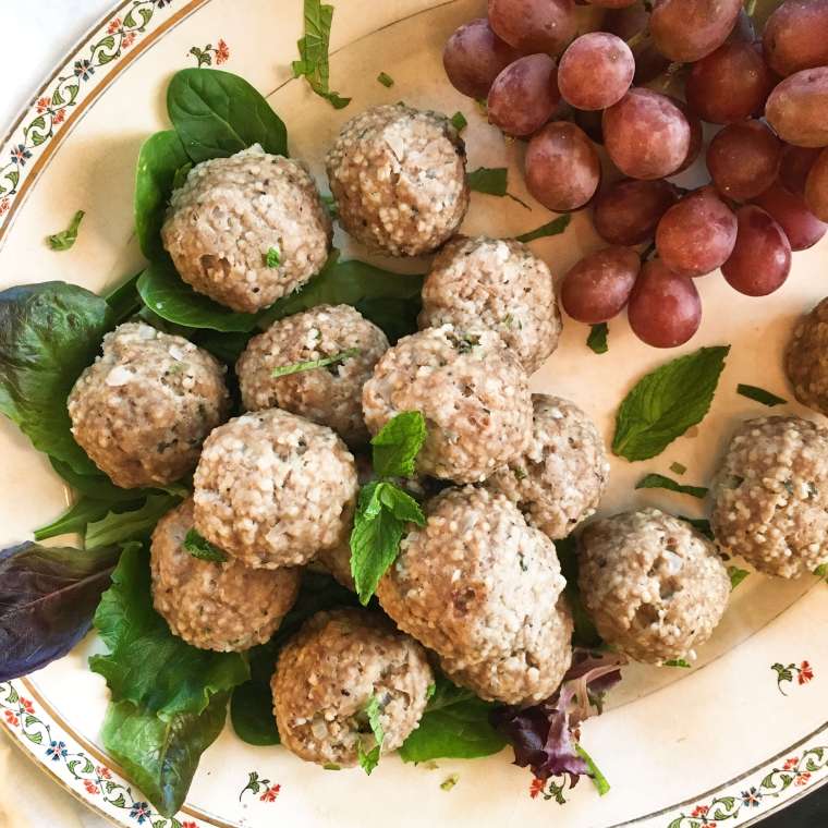 Next time, I’ll experiment with this recipe again in March or April, and add a triple dose of mint to the stuffing to see how that adds to the overall taste. If you try this recipe now, during the winter months, I would suggest serving them with a dollop of mint jelly or a spicy habanero jelly to add another dynamic layer of flavor. Traditionally, this food would be served alongside a heaping pile of rice pilaf or in a shallow basin of broth, like a soup, but because we are featuring just one recipe from each country on this Tour (although this week had two because of the broth) I served these meatballs with a simple side salad and some fresh grapes in lieu of the suggested Armenian Rice Pilaf recipe that followed in the cookbook.