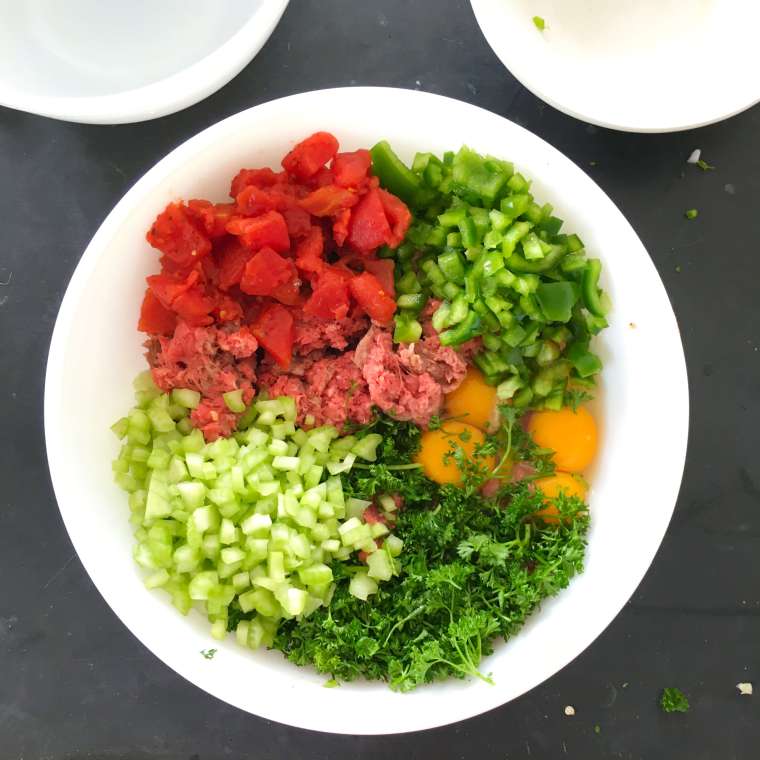 While the onions are cooking, place the meat in a large bowl. Add the eggs, celery, green pepper, parsley and tomatoes.