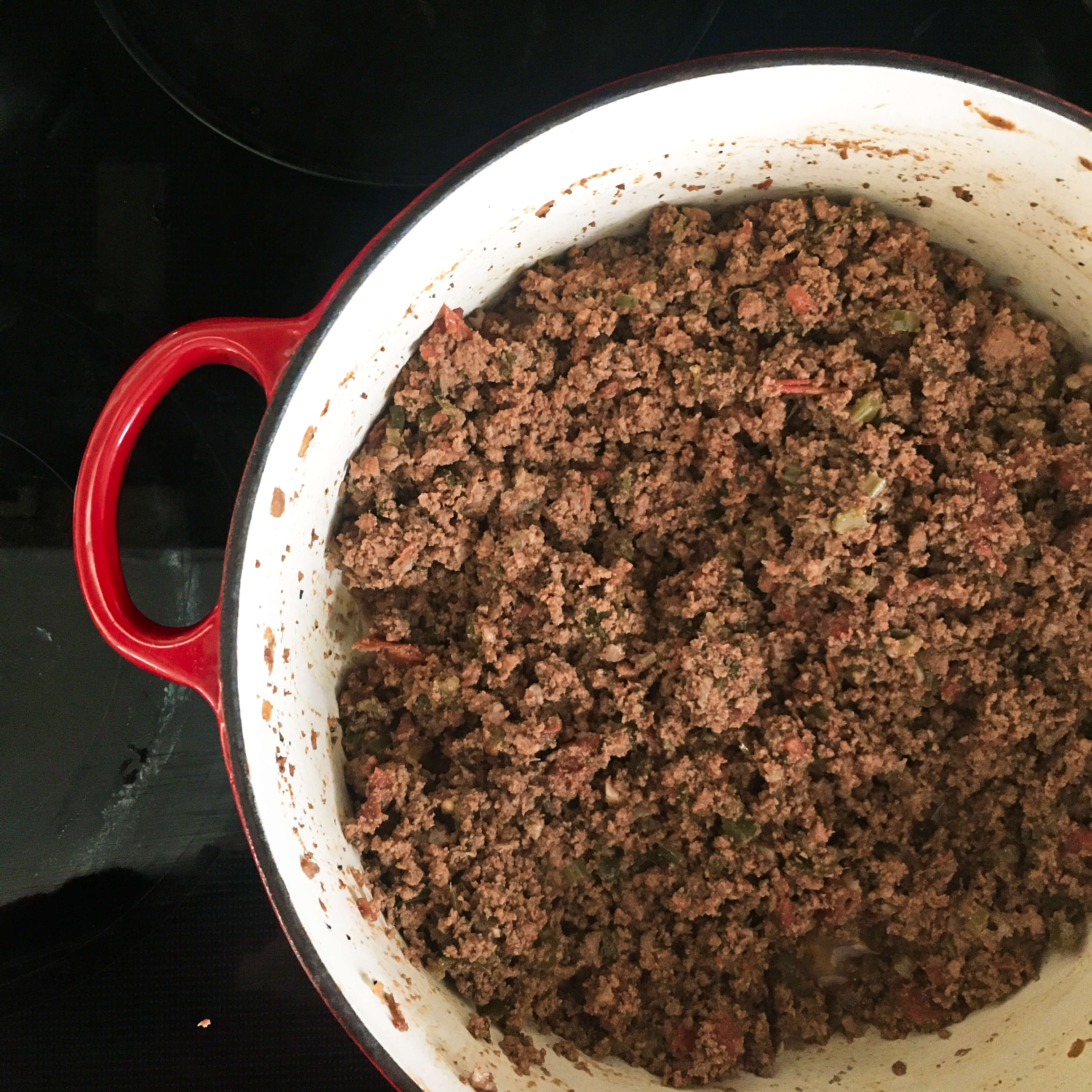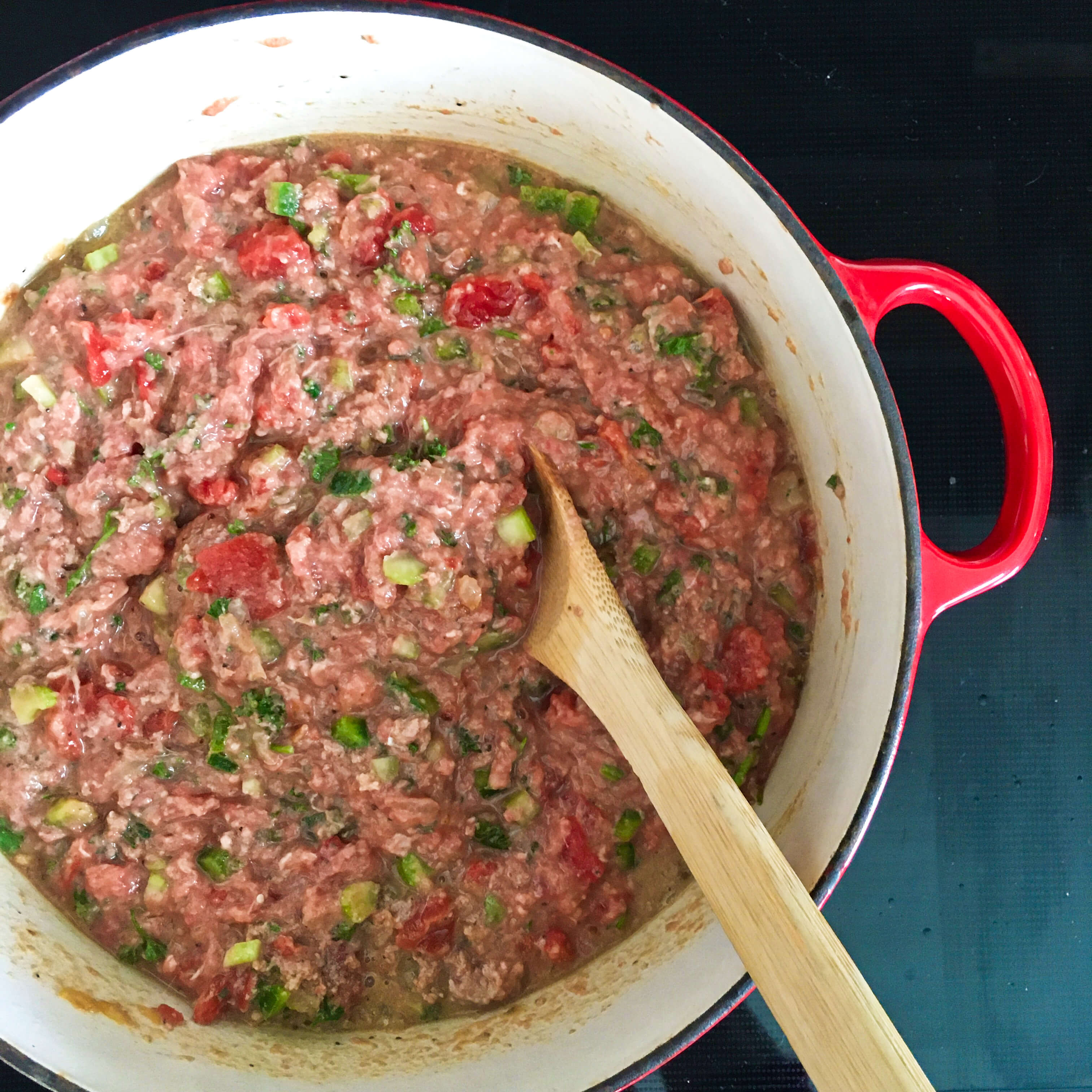 Add the remaining wine and red pepper flakes (I used about two pinches), then partly cover and cook, stirring occasionally, one hour or longer. At the beginning of the one hour of cooking, the picadinho will be very liquidy, but as it cooks over the next 60 minutes, it will dry out and all of the moisture will evaporate. At that stage it will look like this…