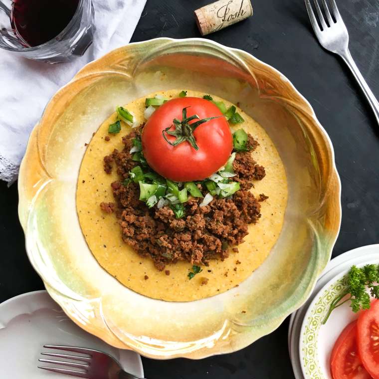 Between the fruity notes of the wine, the citrus notes of the tomatoes and the sweetness of the onions, combined with the fact that it looks a lot like taco meat, my first impression upon tasting it was to pair it with something in the corn family. Something like tortillas. Although this dish would be fantastic with such a companion, corn tortillas are not widely consumed in Brazil, so to stick a little closer to a more authentic meal, I chose corn grits since they are more similar to the consistency of farofa. Made with milk, Parmesan cheese and butter, the grits add color, a creamy texture and a complimentary corn flavor that blends all the ingredients in the picadinho together so well. I also added some freshly chopped onion, parsley and green pepper for a burst of fresh crunch and more color.