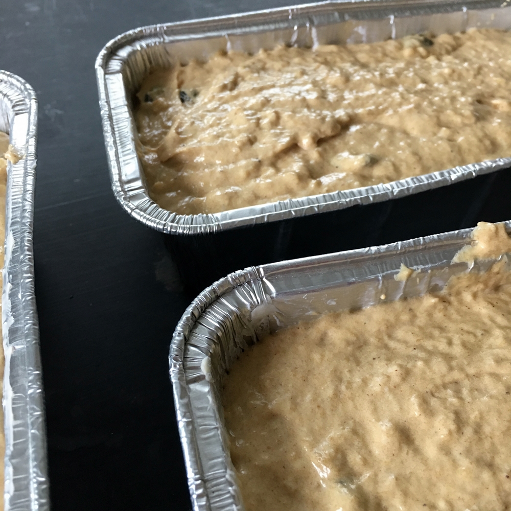 After they were all mixed together, the batter was ready to be parceled out into three loaf pans…